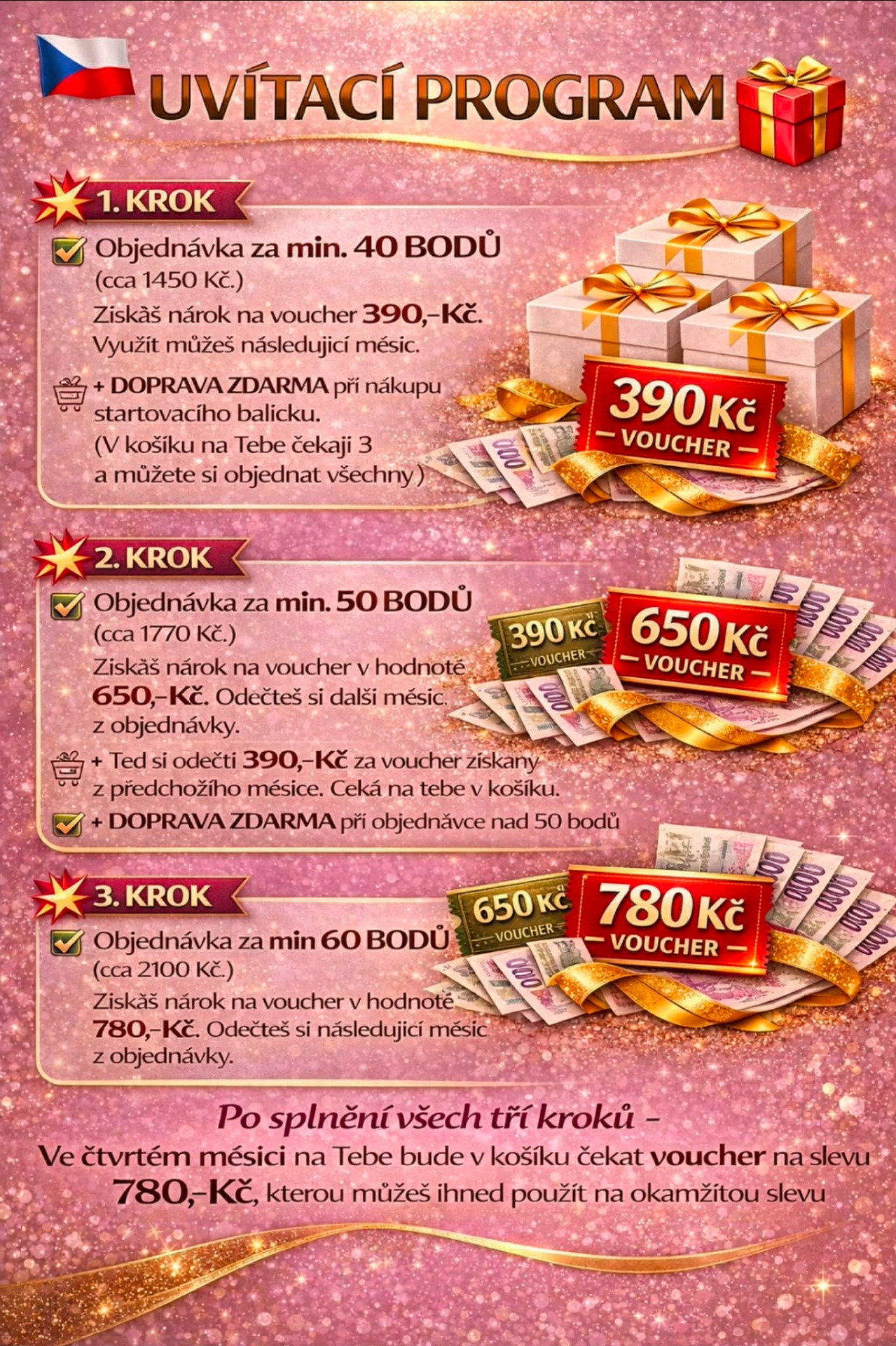 💥 Po splnění všech tří kroků na Tebe bude čtvrtý měsíc v košíku čekat VOUCHER na slevu 780,- Kč, kterou můžeš ihned použít na okamžitou slevu Tvého nákupu 💥